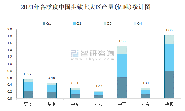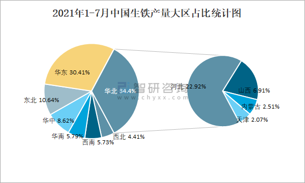 2021年1-7月中國生鐵產量為5.3億噸 華北地區產量最高(占比34.4%)