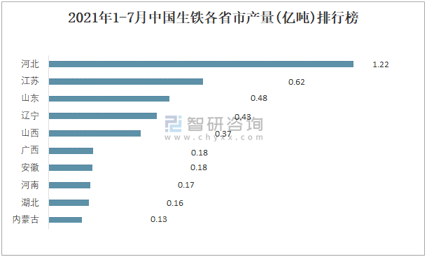 根據國家統計局數據顯示:2021年各季度(第三季度暫只統計7月數據)中國生鐵主要集中在華北、華東、東北地區生產;2021年1-7月中國生鐵產量大區分布不均衡,其中華北地區產量最高,特別是河北省貢獻了最多產量;2021年1-7月中國生鐵各省市產量top1遙遙領先于其他前9名。