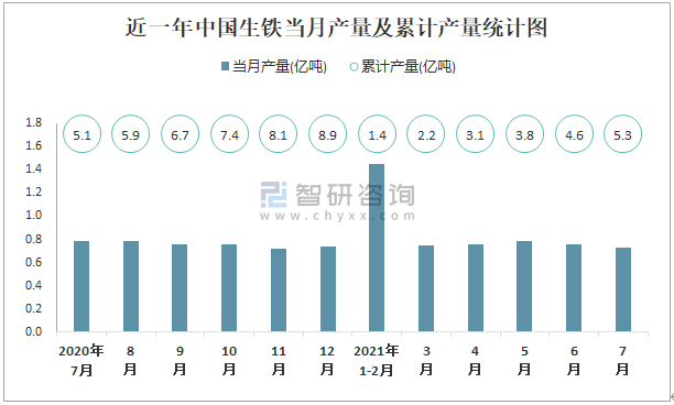 根據國家統計局數據顯示:2021年7月中國生鐵產量為0.7億噸,同比下降8.9%;2021年1-7月中國生鐵累計產量為5.3億噸,累計增長2.3%;2015-2020年中國生鐵產量逐年遞增,2020年達到最高。