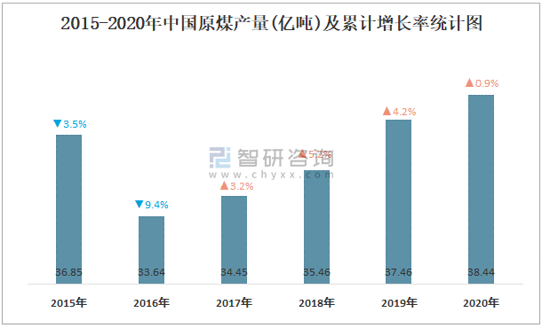 2015-2020年中國(guó)原煤產(chǎn)量及增長(zhǎng)情況統(tǒng)計(jì)圖