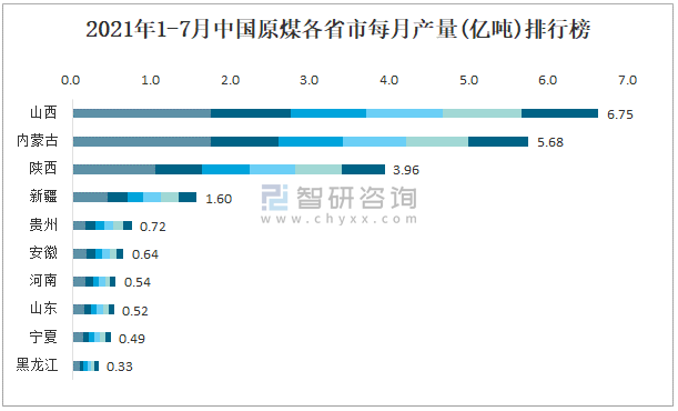 2021年1-7月中國(guó)原煤各省市每月產(chǎn)量排行榜