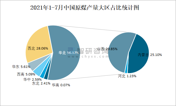 2021年1-7月中國(guó)原煤產(chǎn)量大區(qū)占比統(tǒng)計(jì)圖