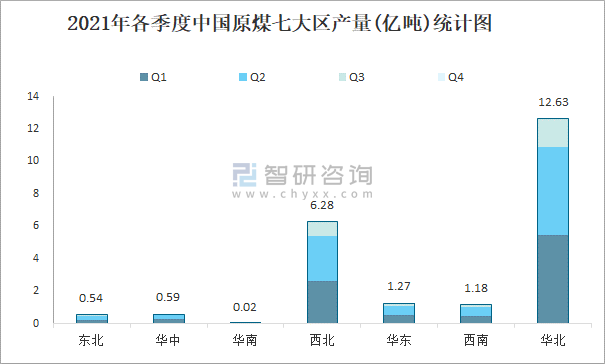 2021年各季度中國(guó)原煤七大區(qū)產(chǎn)量統(tǒng)計(jì)圖