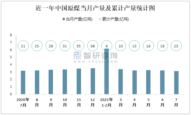 根據(jù)國(guó)家統(tǒng)計(jì)局?jǐn)?shù)據(jù)顯示:2021年7月中國(guó)原煤產(chǎn)量為3.1億噸,同比下降3.3%;2021年1-7月中國(guó)原煤累計(jì)產(chǎn)量為22.6億噸,累計(jì)增長(zhǎng)4.9%;2015-2020年中國(guó)原煤產(chǎn)量2016年跌至最低,此后逐年遞增。