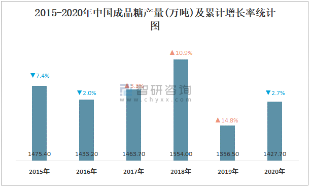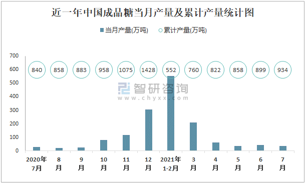根據國家統計局數據顯示:2021年7月中國成品糖產量為34萬噸,同比增長4%;2021年1-7月中國成品糖累計產量為933.5萬噸,累計增長9.7%;2015-2020年中國成品糖產量2019年跌至最低,次年有所回升。