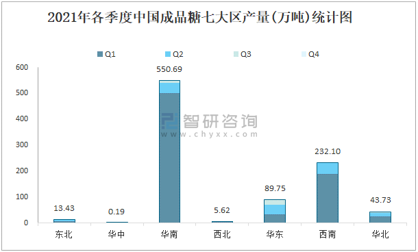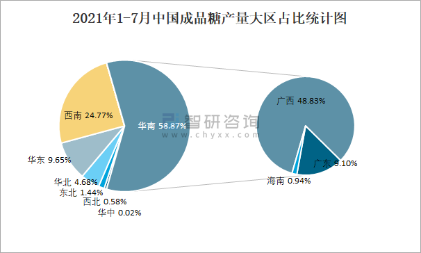 根據國家統計局數據顯示:2021年各季度(第三季度暫只統計7月數據)中國成品糖主要集中在華南、西南、華東地區生產;2021年1-7月中國成品糖產量大區分布不均衡,其中華南地區產量最高,特別是廣西壯族自治區貢獻了最多產量;2021年1-7月中國成品糖各省市產量top1遙遙領先于其他前9名。
