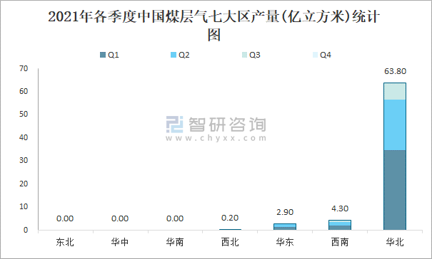 根據國家統計局數據顯示:2021年各季度(第三季度暫只統計7月數據)中國煤層氣主要集中在華北、西南、華東地區生產;2021年1-7月中國煤層氣產量大區分布不均衡,其中華北地區產量最高,特別是山西省貢獻了最多產量;2021年1-7月中國煤層氣各省市產量top1遙遙領先于其他前9名。