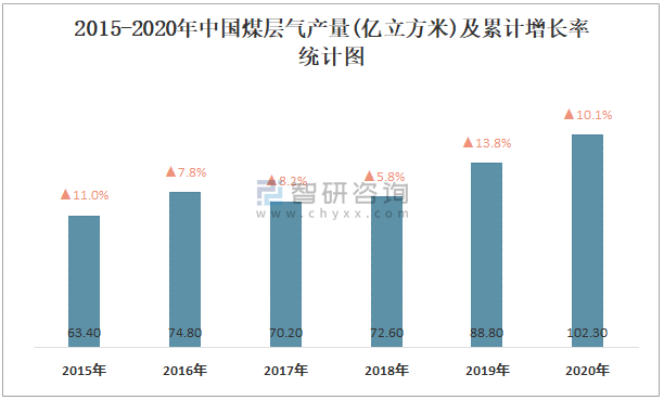 2015-2020年中國煤層氣產量及增長情況統計圖