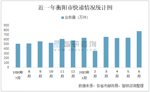 根據(jù)各省市郵政局?jǐn)?shù)據(jù)可知:2021年6月衡陽市快遞業(yè)務(wù)量為775萬件,業(yè)務(wù)收入為-萬元;2021年1-6月衡陽市快遞累計(jì)業(yè)務(wù)量為3674.65萬件,同比增長28.5%。