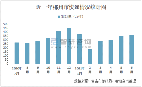 根據各省市郵政局數據可知:2021年6月郴州市快遞業務量為360.89萬件,業務收入為-萬元;2021年1-6月郴州市快遞累計業務量為1856.22萬件,同比增長46.7%。