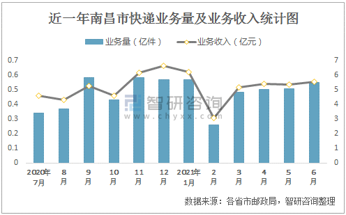 近一年南昌市快遞業務量及業務收入統計圖