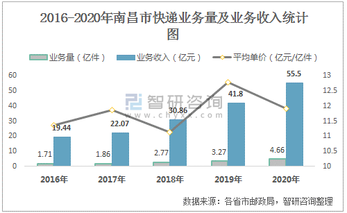 2016-2020年南昌市快遞業務量及業務收入統計圖