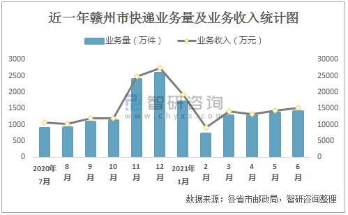 近一年贛州市快遞業(yè)務量及業(yè)務收入統(tǒng)計圖