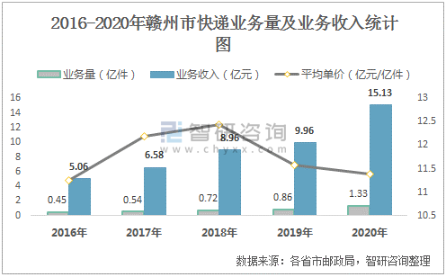 2016-2020年贛州市快遞業(yè)務量及業(yè)務收入統(tǒng)計圖