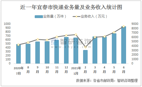 根據各省市郵政局數據可知:2021年6月宜春市快遞業務量為933.79萬件,業務收入為8468.91萬元;2021年1-6月宜春市快遞累計業務量為4000.75萬件,同比增長80.9%,累計業務收入為38089.09萬元,同比增長25.77%;2016-2020年宜春市快遞業務量逐年遞增,業務收入總體呈現上升趨勢,平均單價2019年跌至最低值,次年出現小幅度上漲。