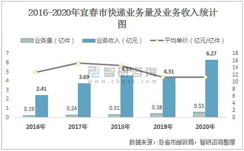 2016-2020年宜春市快遞業務量及業務收入統計圖