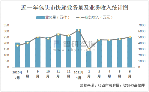 近一年包頭市快遞業(yè)務(wù)量及業(yè)務(wù)收入統(tǒng)計圖