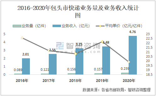2016-2020年包頭市快遞業(yè)務(wù)量及業(yè)務(wù)收入統(tǒng)計圖