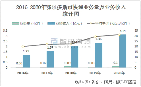 2016-2020年鄂爾多斯市快遞業務量及業務收入統計圖