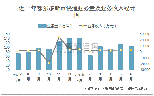 根據各省市郵政局數據可知:2021年6月鄂爾多斯市快遞業務量為104.77萬件,業務收入為3287.48萬元;2021年1-6月鄂爾多斯市快遞累計業務量為616.37萬件,同比增長50.16%,累計業務收入為20156.37萬元,同比增長62.22%;2016-2020年鄂爾多斯市快遞業務量總體呈現上升趨勢,業務收入逐年遞增,平均單價逐年遞增。