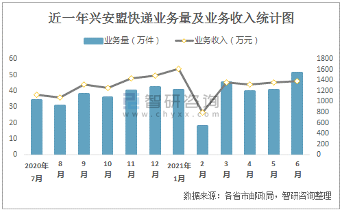 近一年興安盟快遞業(yè)務量及業(yè)務收入統(tǒng)計圖