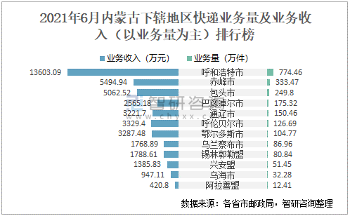 2021年6月內蒙古下轄地區(qū)快遞業(yè)務量及業(yè)務收入(以業(yè)務量為主)排行榜