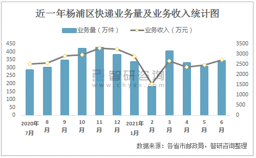 近一年楊浦區(qū)快遞業(yè)務(wù)量及業(yè)務(wù)收入統(tǒng)計圖