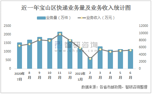 近一年寶山區快遞業務量及業務收入統計圖
