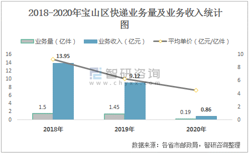 2018-2020年寶山區快遞業務量及業務收入統計圖