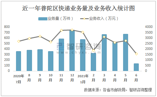 近一年普陀區(qū)快遞業(yè)務(wù)量及業(yè)務(wù)收入統(tǒng)計圖
