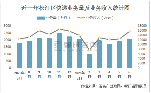 2021年6月松江區快遞業務量與業務收入分別為2047.5萬件和15650萬元