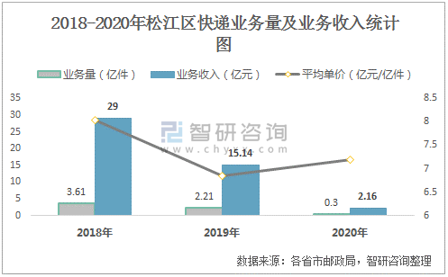 2018-2020年松江區快遞業務量及業務收入統計圖