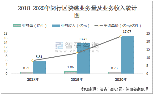 2018-2020年閔行區快遞業務量及業務收入統計圖