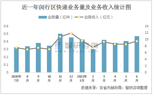近一年閔行區快遞業務量及業務收入統計圖