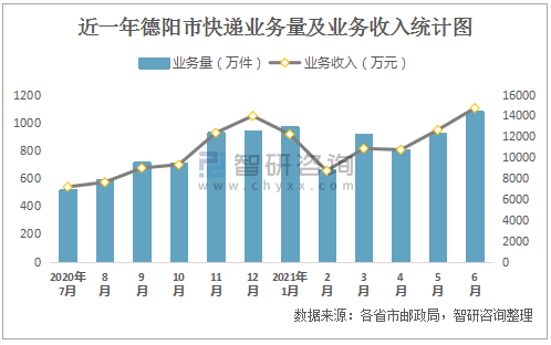根據各省市郵政局數據可知:2021年6月德陽市快遞業務量為1075.27萬件,業務收入為14705.61萬元;2021年1-6月德陽市快遞累計業務量為533.17萬件,同比增長82.46%,累計業務收入為69767.94萬元,同比增長81.81%;2019-2020年德陽市快遞業務與業務收入均呈現上升趨勢。