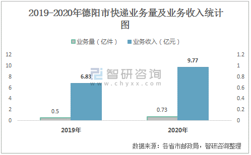 2019-2020年德陽市快遞業務量及業務收入統計圖