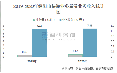 2019-2020年綿陽市快遞業務量及業務收入統計圖