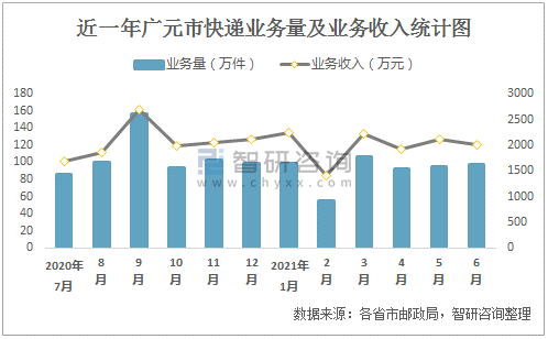 近一年廣元市快遞業(yè)務(wù)量及業(yè)務(wù)收入統(tǒng)計(jì)圖