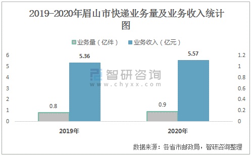 2019-2020年眉山市快遞業(yè)務(wù)量及業(yè)務(wù)收入統(tǒng)計圖