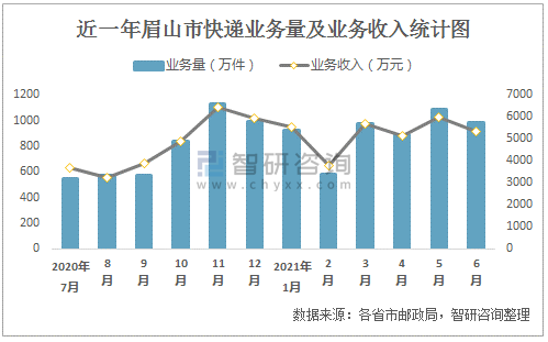 根據(jù)各省市郵政局?jǐn)?shù)據(jù)可知:2021年6月眉山市快遞業(yè)務(wù)量為980.5萬件,業(yè)務(wù)收入為5314.62萬元;2021年1-6月眉山市快遞累計業(yè)務(wù)量為5439.9萬件,同比增長25.64%,累計業(yè)務(wù)收入為31429.24萬元,同比增長13.46%;2019-2020年眉山市快遞業(yè)務(wù)量與業(yè)務(wù)收入均呈現(xiàn)上升趨勢。