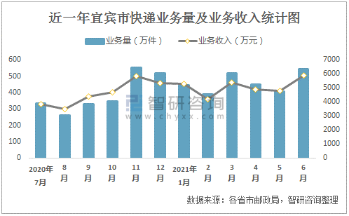 根據(jù)各省市郵政局數(shù)據(jù)可知:2021年6月宜賓市快遞業(yè)務(wù)量為540.87萬件,業(yè)務(wù)收入為5892.06萬元;2021年1-6月宜賓市快遞累計業(yè)務(wù)量為2741萬件,同比增長67.47%,累計業(yè)務(wù)收入為30374.29萬元,同比增長46.21%;2019-2020年宜賓市快遞業(yè)務(wù)量與業(yè)務(wù)收入均呈現(xiàn)上升趨勢。