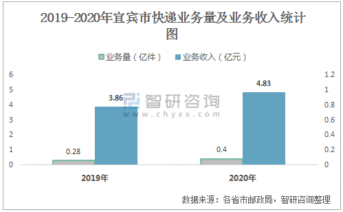 2019-2020年宜賓市快遞業(yè)務(wù)量及業(yè)務(wù)收入統(tǒng)計圖