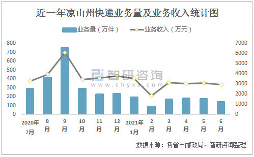 近一年涼山州快遞業(yè)務(wù)量及業(yè)務(wù)收入統(tǒng)計(jì)圖