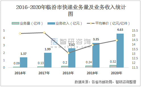 2016-2020年臨汾市快遞業務量及業務收入統計圖