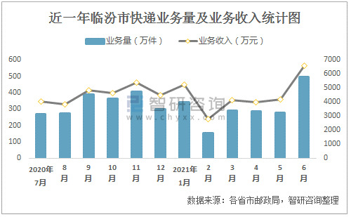近一年臨汾市快遞業務量及業務收入統計圖