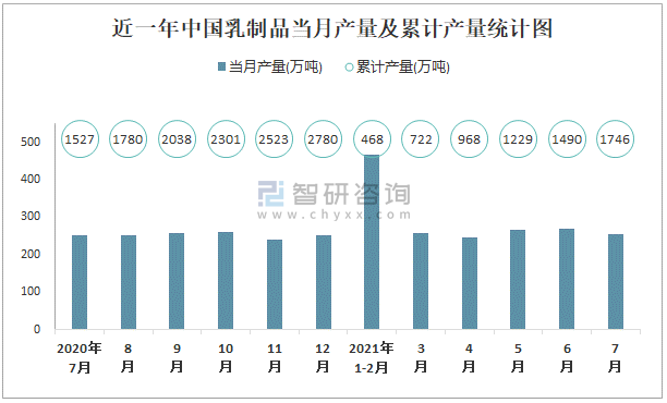 近一年中國(guó)乳制品當(dāng)月產(chǎn)量及累計(jì)產(chǎn)量統(tǒng)計(jì)圖
