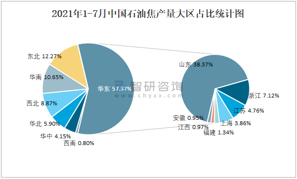 2021年1-7月中國石油焦產量大區占比統計圖