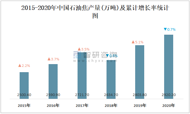 2015-2020年中國石油焦產量及增長率統計圖