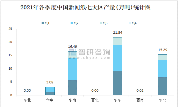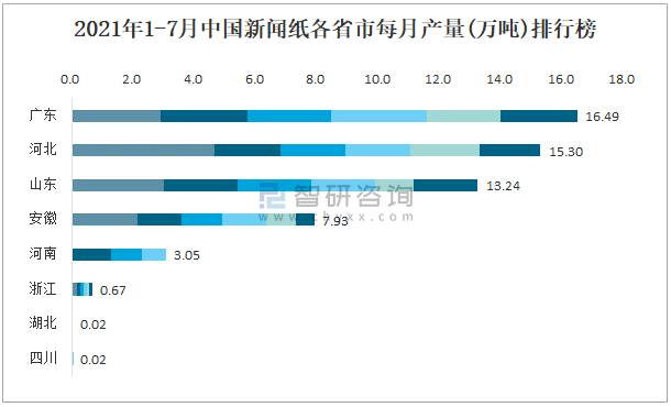 根據國家統計局數據顯示:2021年各季度(第三季度暫只統計7月數據)中國新聞紙主要集中在華東、華南、華北地區生產;2021年1-7月中國新聞紙產量大區分布不均衡,其中華東地區產量最高,特別是山東省貢獻了最多產量;2021年1-7月中國新聞紙各省市產量呈現梯隊式分布,廣東、河北、山東等省產量最多。