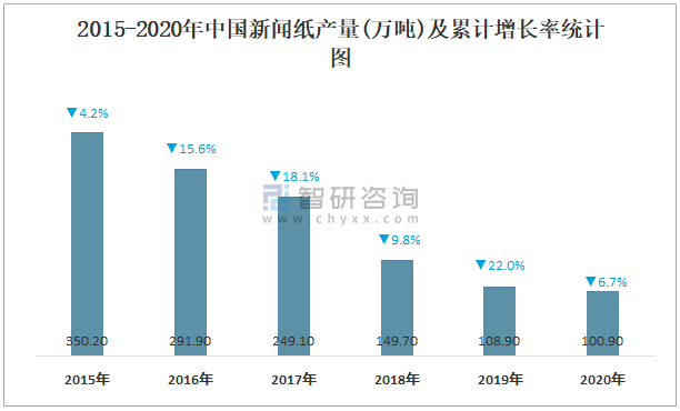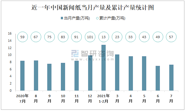 根據國家統計局數據顯示:2021年7月中國新聞紙產量為7.3萬噸,同比下降13.1%;2021年1-7月中國新聞紙累計產量為56.7萬噸,累計下降3.4%;2015-2020年中國新聞紙產量2015年達到最高,此后逐年遞減。